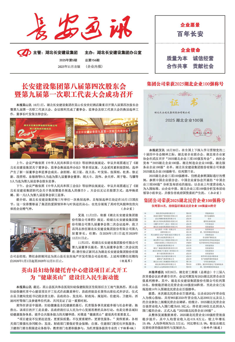 • 2025-09-27 湖北長安建設集團股份有限公司 榮獲2025湖北民營企業100強稱號,位列第35名